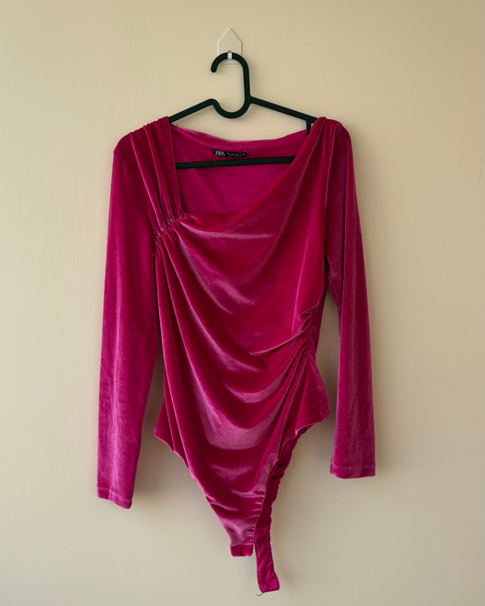 Fuschia pink velvet ruched bodysuit