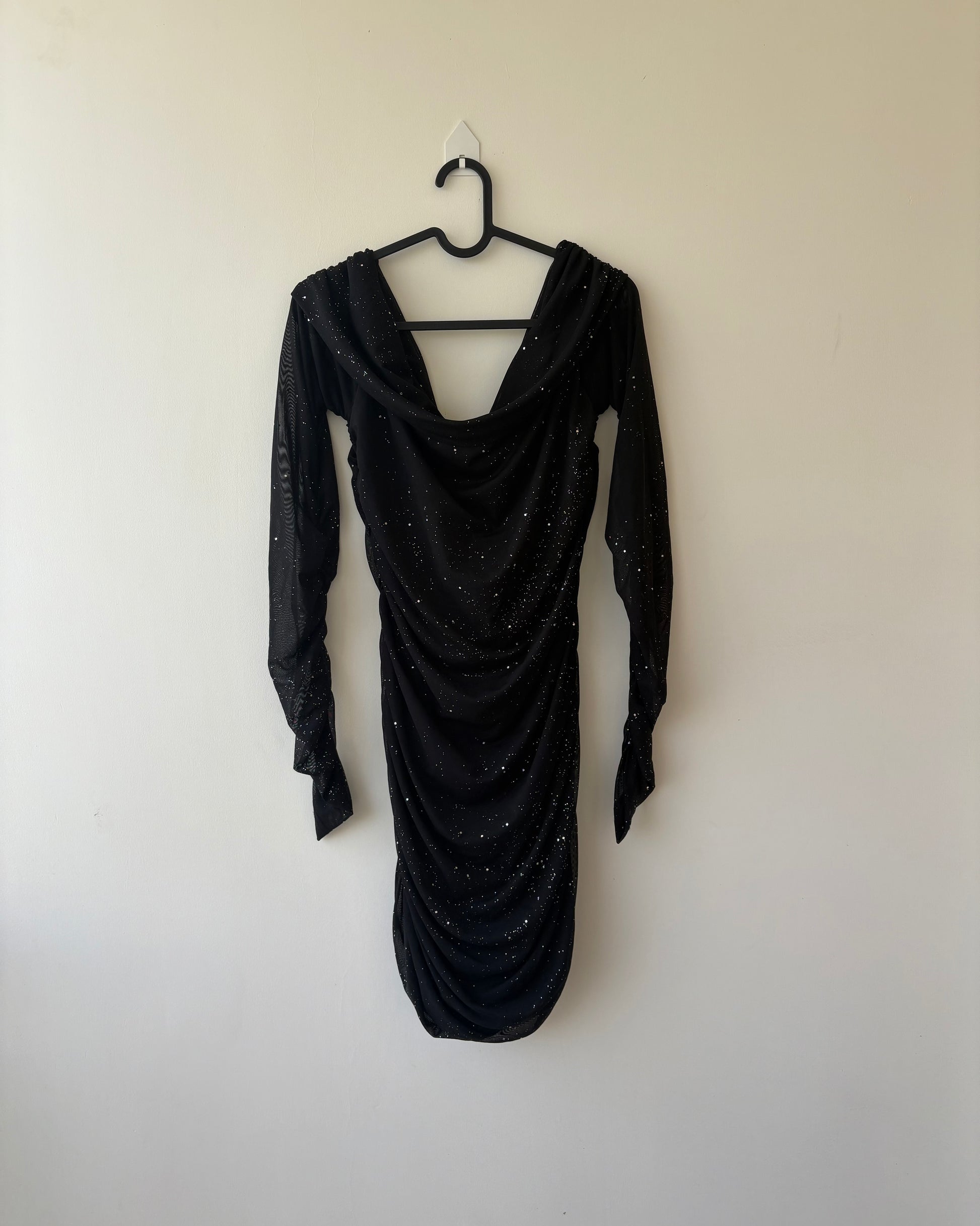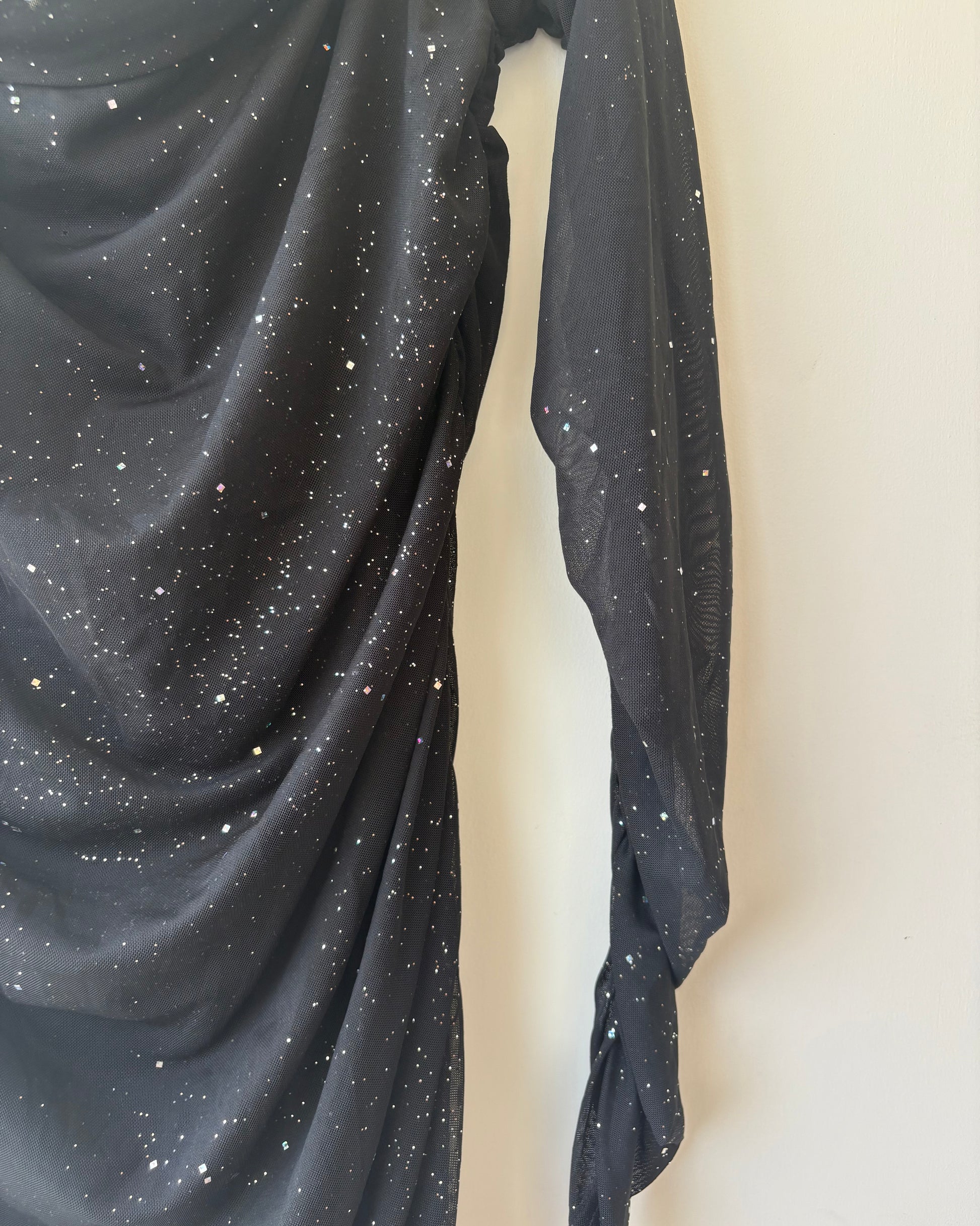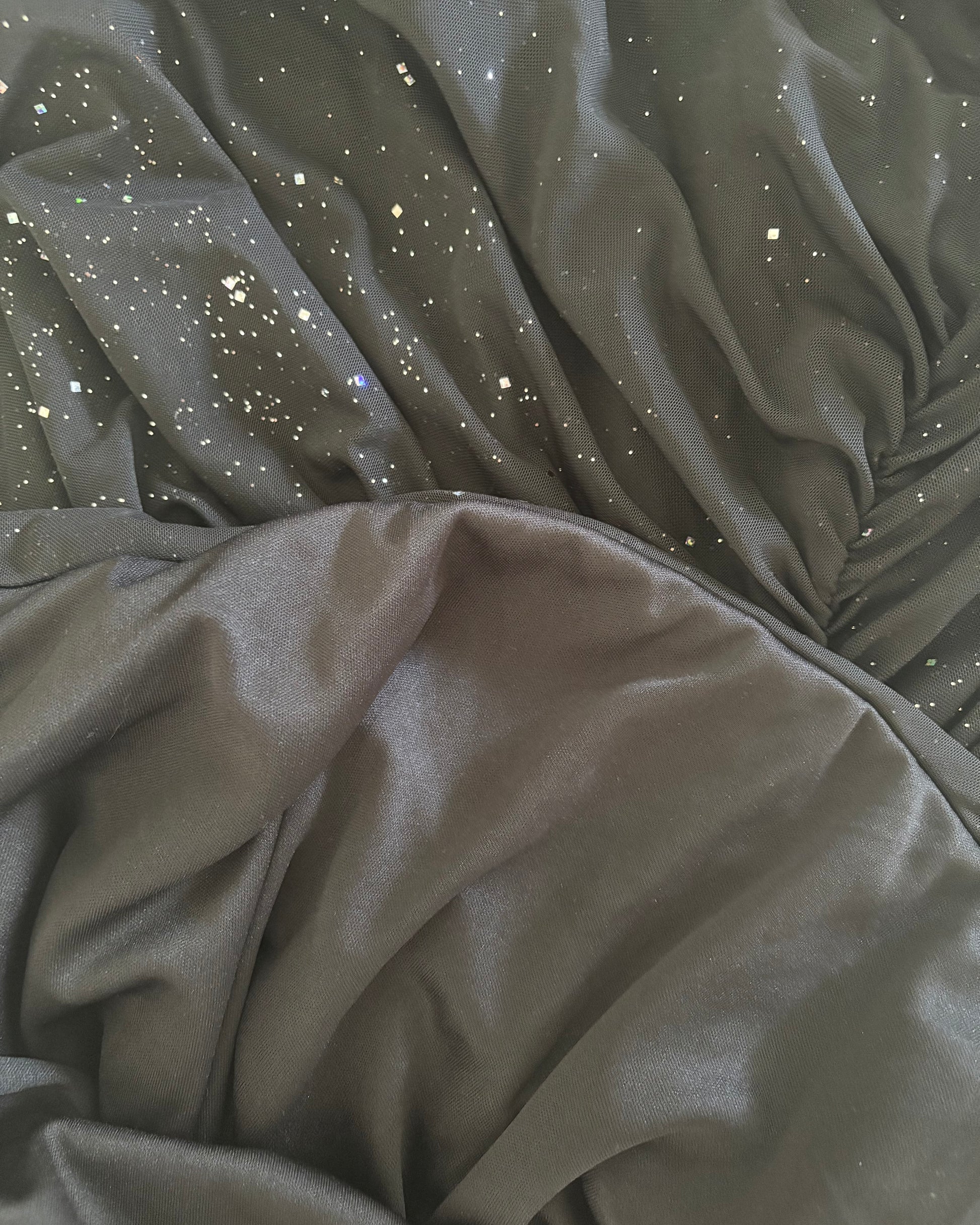 Black offsholder ruched dress with shimmer